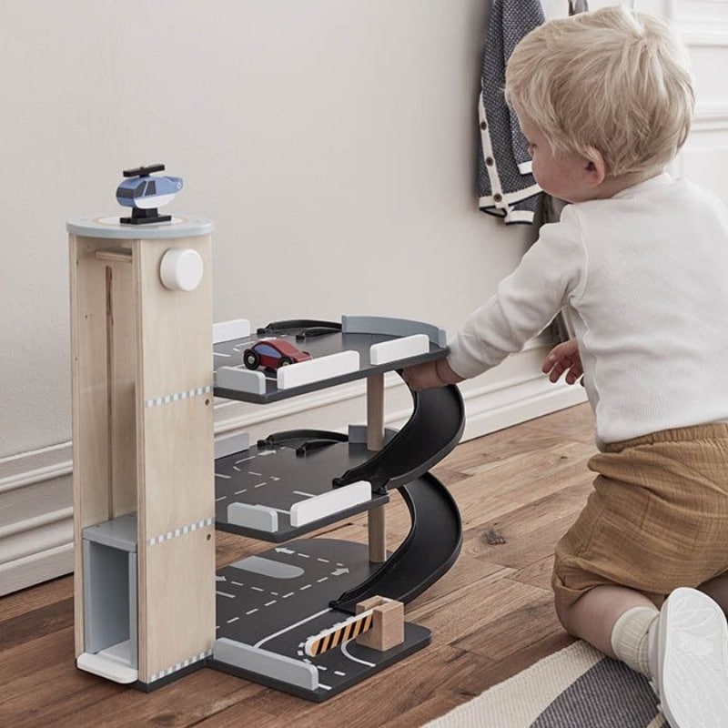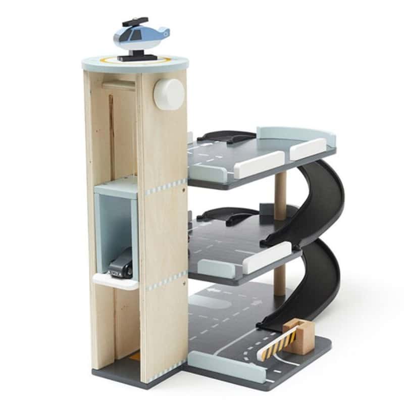 Deze houten parkeergarage met drie verdiepingen, drie auto's en een helikopter is een geweldige toevoeging aan het speelgoed van je kind. Met leuke details zoals parkeerplaatsen, opritten en zelfs een werkende lift zorgt deze parkeergarage voor urenlang speelplezier. Bovendien helpen de bijgeleverde houten voertuigen je kind om de oog-handcoördinatie te oefenen terwijl ze hun eigen verhalen en avonturen bedenken. Haal deze parkeergarage in huis en stimuleer de creativiteit van je kinderen!